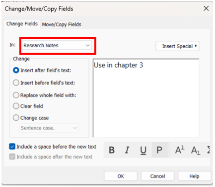 Note: Be careful using Replace whole field with. Using this option will delete any existing text in the selected field in all selected references.